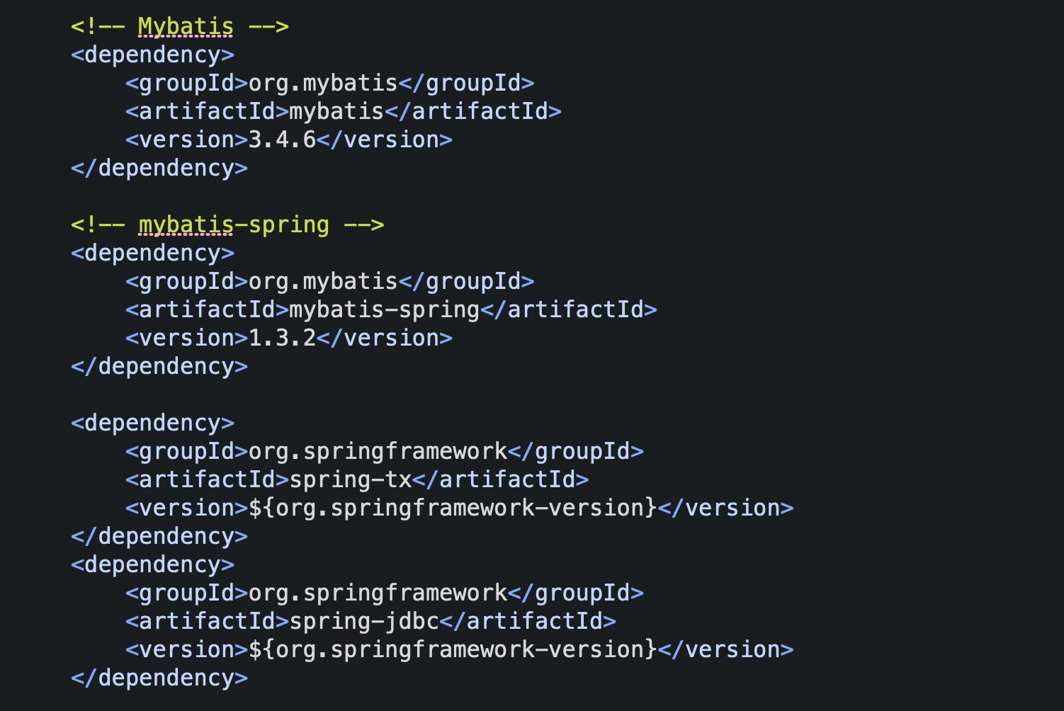 MyBatis와 mybatis-spring을 사용하기 위해서 pom.xml 파일에 추가적인 라이브러리들을 설정해야 한다.