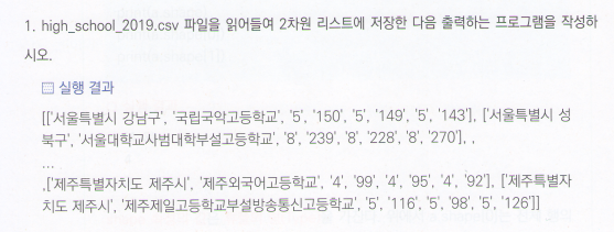 import csv import numpy as np f = open('high_school_2019.csv','r',encoding='utf-8') lines = csv.reader(f) header = next(lines) list_data = [] #데이터 받을 2차원 리스트 초기화 for line in lines : #전체데이터만큼 반복하여 list_data.append(line[:]) #한행씩 추가 print(list_data) f.close #실행결과 [['서울특별시 강남구', '국립국악고등학교', '5', '150', '5', '149', '5', '143'], ['서울특별시 성북구', '서울대학교사범대학부설고등학..] ......................... import csv imp..