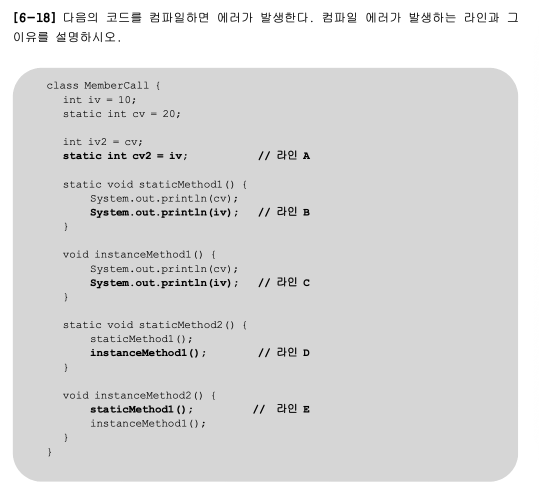 - 내가 적은 답 - iv = 인스턴스 변수 -> 인스턴스가 생성될 때 생성된다. - cv = 클래스 변수 -> 클래스가 생성될 때 생성된다. - 라인 A/B/D - 인스턴스 변수(메서드)는 인스턴스가 생성될 때 만들어지고, 클래스 변수(메서드)는 클래스가 메모리에 올라갈 때 만들어진다. - 클래스변수에 인스턴스 변수를 저장하는것은, 인스턴스 변수가 생성되었는지 모르기 때문에 불가. - 마찬가치로 인스턴스 변수(메서드)가 생성되었는지 확인할 수 없는데, 스태틱메서드에서 사용불가. - 정답 - ㅇㄹㄴ - 오답노트 - - 내가적은답 - - 정답 - ㄹㅇㄴ - 오답노트 - ㄹㄴㅇ - 정답 public class Practice_6_20 { public static int[] shuffle(int[] arr) ..